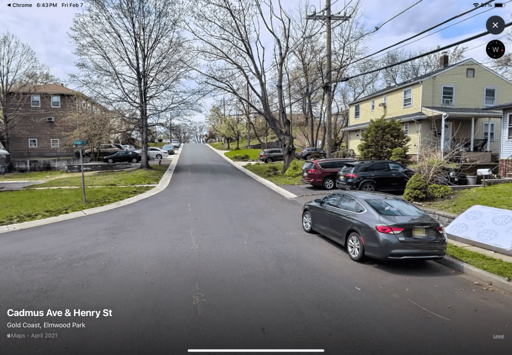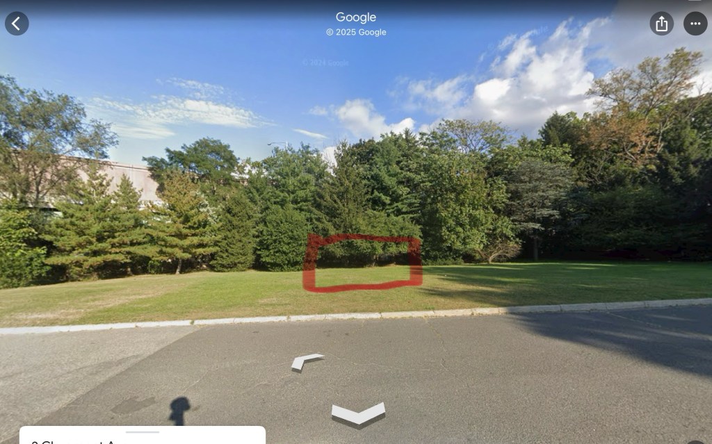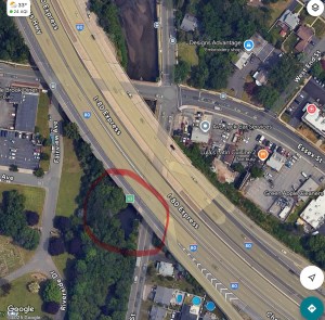 Ground level Google Maps view of tree line along the Saddle River. In the 57 years since my story took place, the trees have grown substantially. The red square was clear of trees when we fished there, that was our approach to the river. There is a fence there now, behind the trees.
