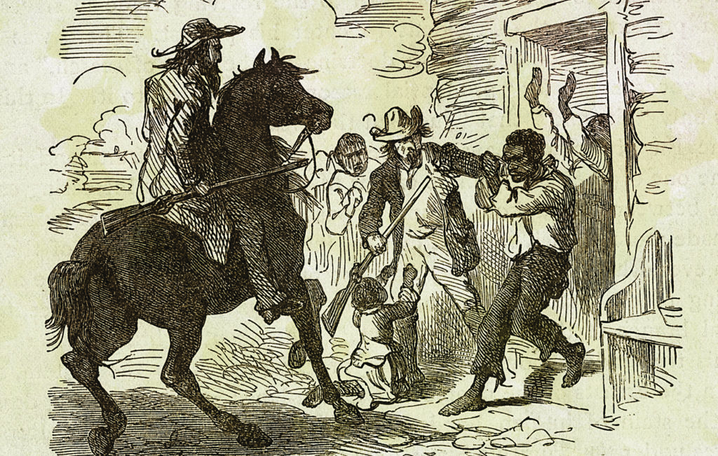 Snatching the writ from the marshal’s hand, the shorter slave hunter proclaimed, “This here paper gives us the theority to look anywhere’s we want!”
